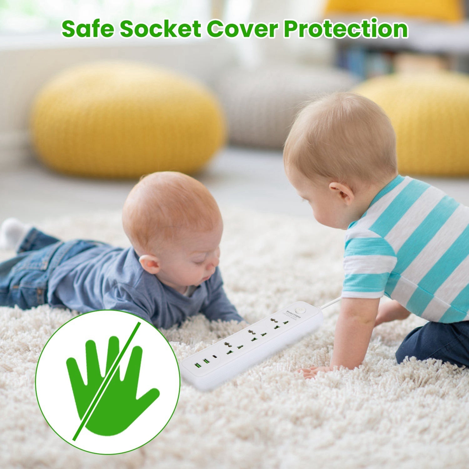 - *Safe Socket Cover Protection*: The safety protection cover is designed to automatically open when the plug is inserted and close when it's removed,effectively preventing children from inserting their fingers or metal objects into the socket and causing accidents. Additionally,sturdy and impact-resistant material ensures long-term stable operation of this USB power strip.